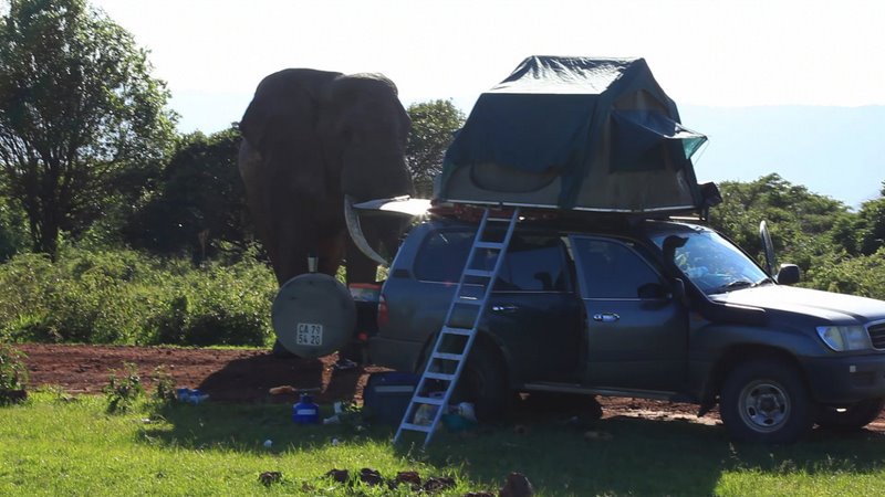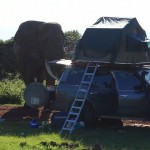 Our third night was spent back at the Simba campsite on the lip of the Ngorongoro crater. We arrived late having picked up a hitch-hiking Masai herdsman as we were trying to repair yet another puncture… amazing guy who spoke Swahili, German, French and English and told the kids about how his herd had been attacked by lions and he was forced to kill one. The next morning we woke much later than normal and as we were slowly packing up, a lone bull elephant emerged from the bush and wandered towards our car. I (Chris) got the three kids into the nearest place we could hide without drawing more attention to ourselves, the roof tent on the car, and we nervously watched through the side window as this enormous elephant picked through our food supplies eating coffee, Weetabix and corn flakes and deposited large gobs of elephant snot on the rest of the food. Fiona, who had been off somewhere filming, calmly asked the safari guides to help scare off the elephant which they did by driving a safari vehicle down towards the elephant and revving the engine.