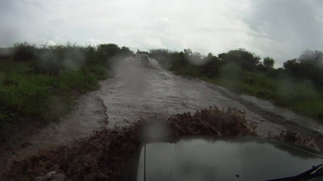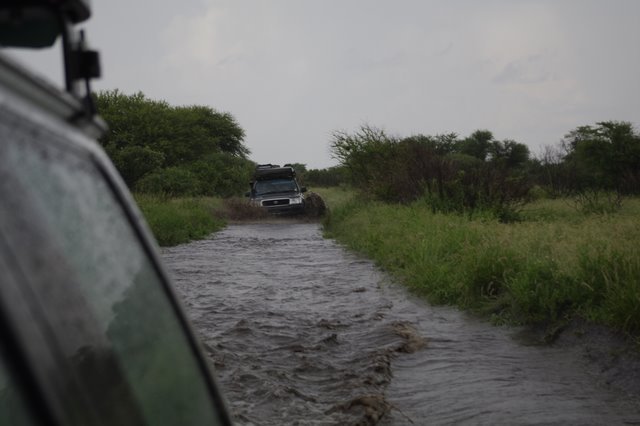 The next morning we woke early (actually we never really slept) and headed back to the Kalahari entrance to try our luck again. It had rained torrentially and thundered all night… We weren’t aware that Botswana typically gets 160mm of rain in all of January and 180mm had fallen on the Kalahari in the prior two days alone (the torrential storms and reports that big parts of Botswana and seven out of nine provinces in South Africa had declared disaster areas might have been a clue) so things were going to be very wet. We made it about 2 kms along the track, trying to avoid the enormous puddle/lakes by skirting offroad around them before we bogged down in deep mud – and got very stuck. It took us two hours to dig, push and pray ourselves out of the swamp we had driven into and head back to the main road with our tails between our legs, evidently defeated. As I started to pump up our tires in preparation for the highway drive to Maun a South African couple, Schalk and Venetia, arrived at the entrance and convinced us that we should go into the Kalahari together – if one of us got stuck, the other could rescue. So, with a little trepidation and against our better judgment, we agreed to give it another try. Rather ominously, two game rangers emerged from the bush having walked 10 kms after getting stuck themselves, but they encouraged us: “just stick to the tracks – you’ll be fine”.