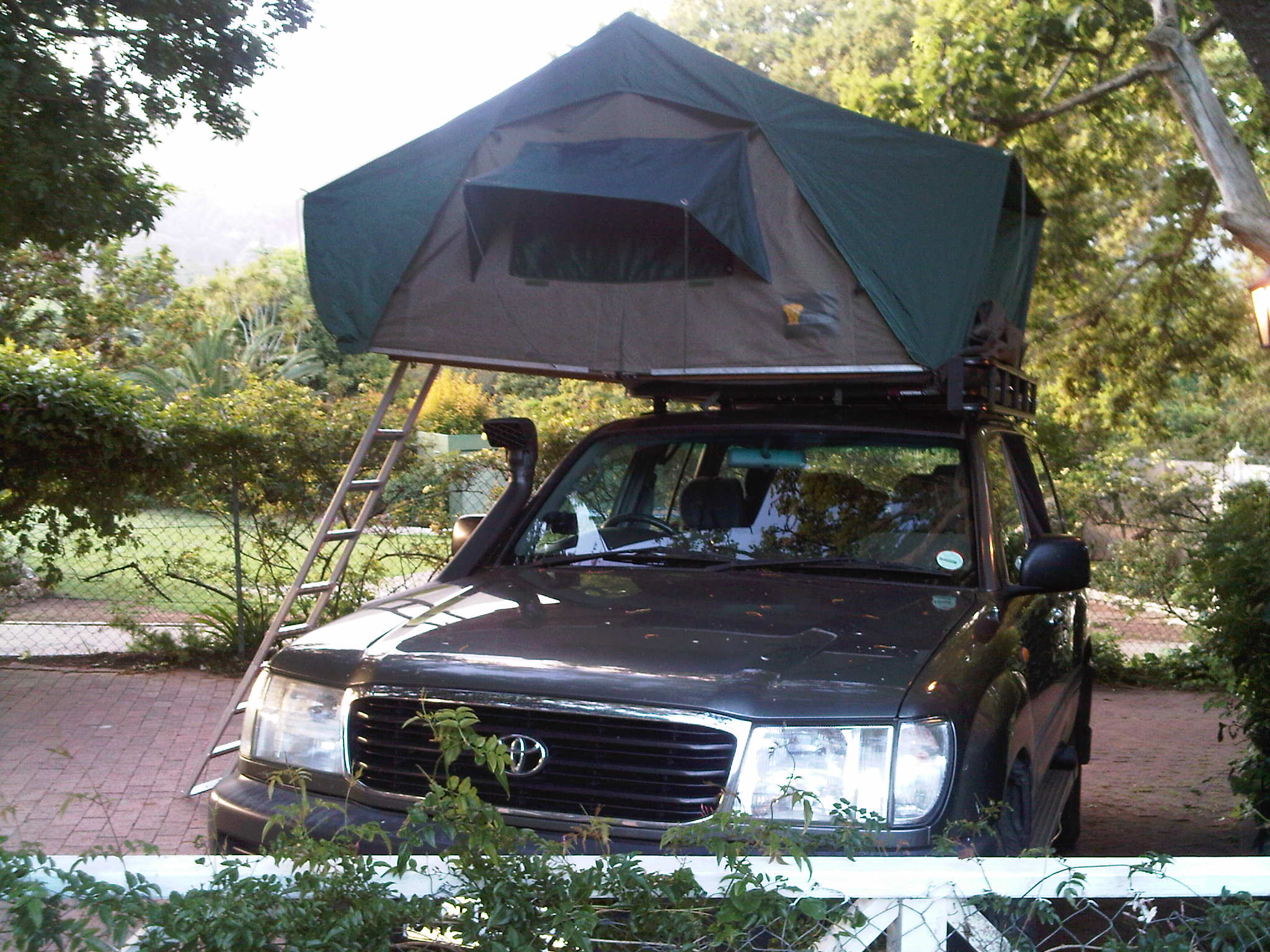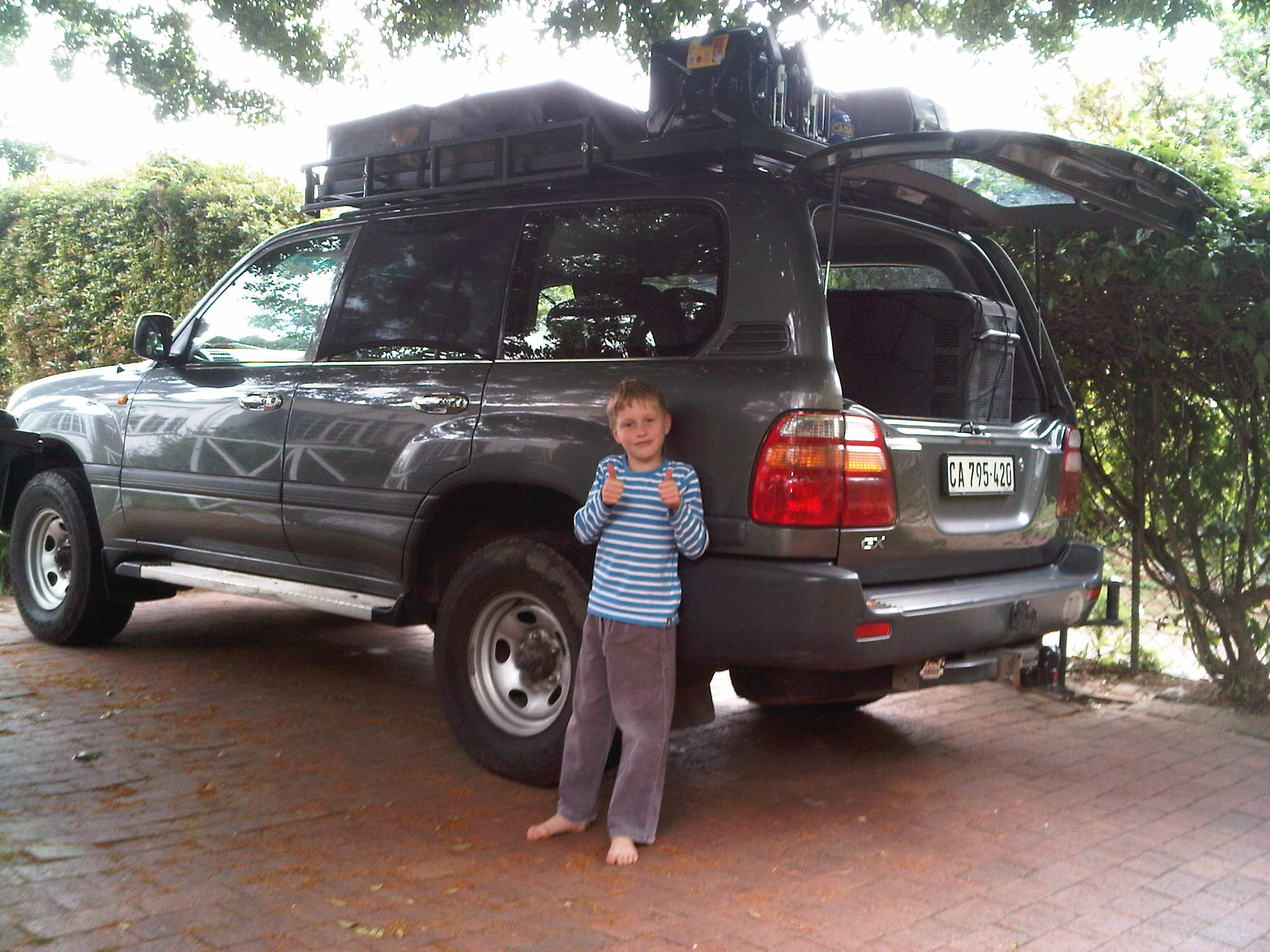 Many thanks to our friends, Trevor and Valentina Knight, we now have a 2 man (or 3 kid) roof tent installed. I had to take the tent to the manufacturer (Hannibal Safari Equipment) in Cape Town to have a new ladder made (the car is taller than the Kinight’s) and a new flysheet added (to keep the rainy season out)… but brilliant! I installed the fridge/freezer, made a shelf for the back area under which ammo boxes can be stored, installed the gas tank, water tank and jerry cans on the roof rack, and installed a cargo netting in the back to keep everything vaguely in place.