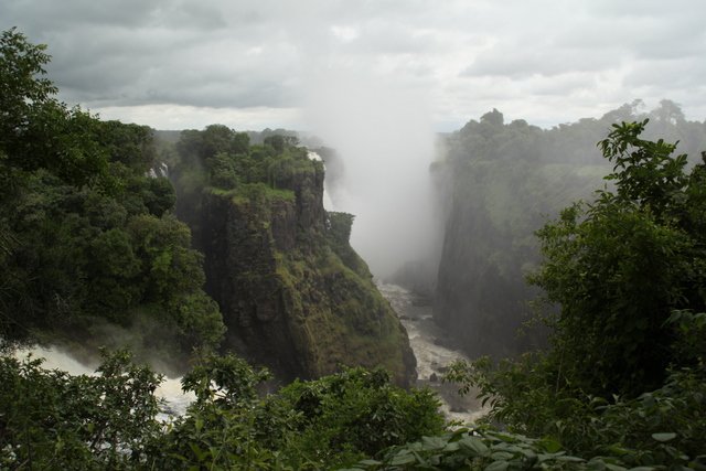 Victoria Falls (the town) is a bit of a typical African tourist town. The falls themselves are spectacular. And the whole spectacle is still very raw and unspoiled: no one has erected whopping great security barriers everywhere to protect you from yourself and there’s a refreshing lack of “mind the canyon” nanny-state reminders about the obvious dangers. What fences there are to prevent you from falling to your death are fashioned from twigs and dead tree branches.
